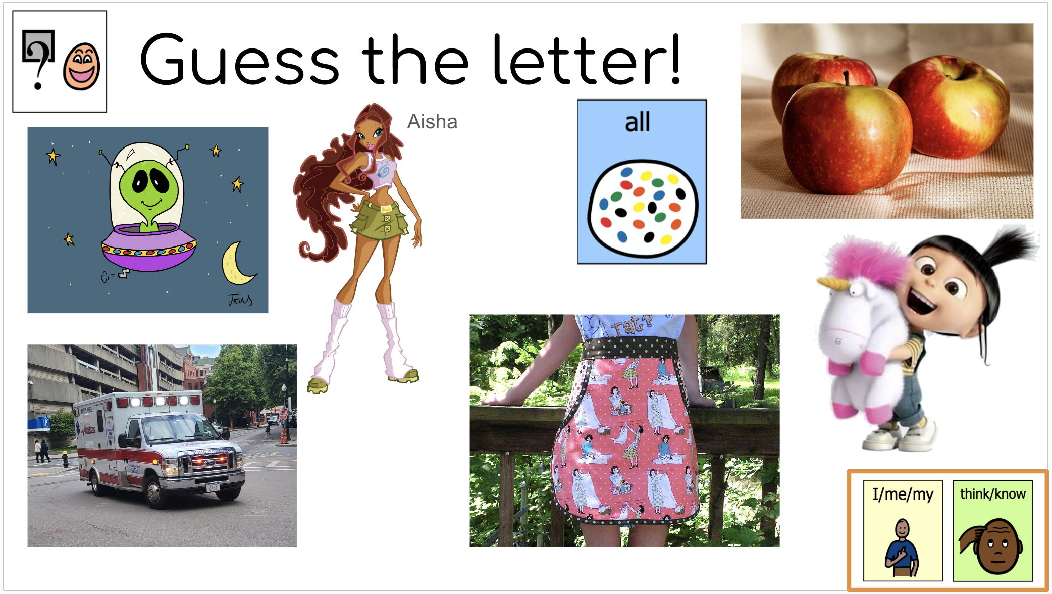 - My “hook” activity lately is Guess the Letter. This activity attempts to catch the attention / interest of my learners and bring them into the lesson. I try to incorporate logos, special interests, characters, food preferences, Core Words, student and staff photos, etc. to increase student interest. Additionally, I include the Core Words “I/me/my” and “think/know” to prompt staff and students to model/use Core Words when guessing the Letter.