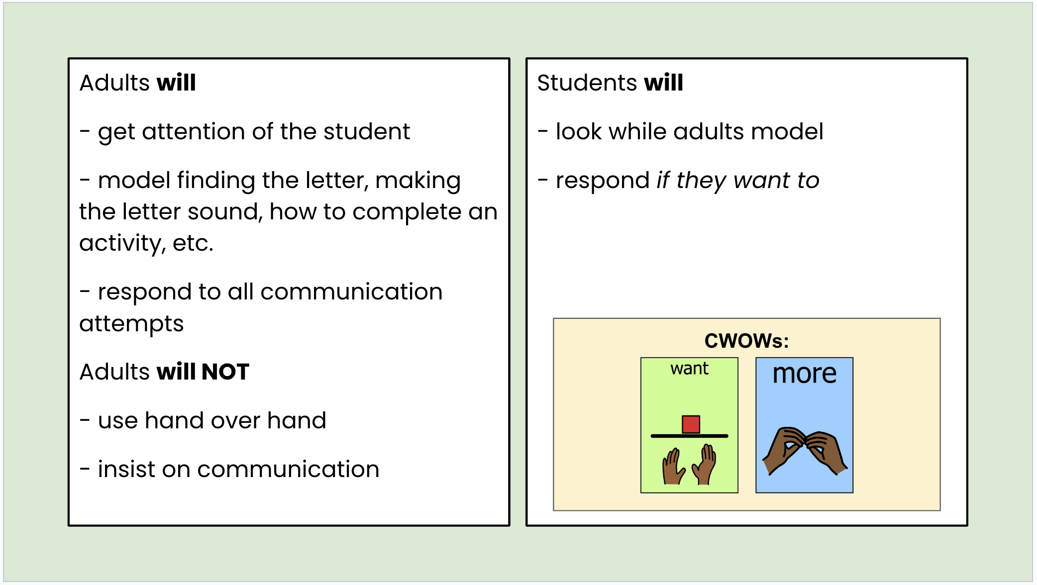 - Students are encouraged to highlight, point to, or say the letter when they see it in the text. I also include our CWOWs again so staff can have a reminder to try to find opportunities to model the Core Words of the Week across all settings and activities.