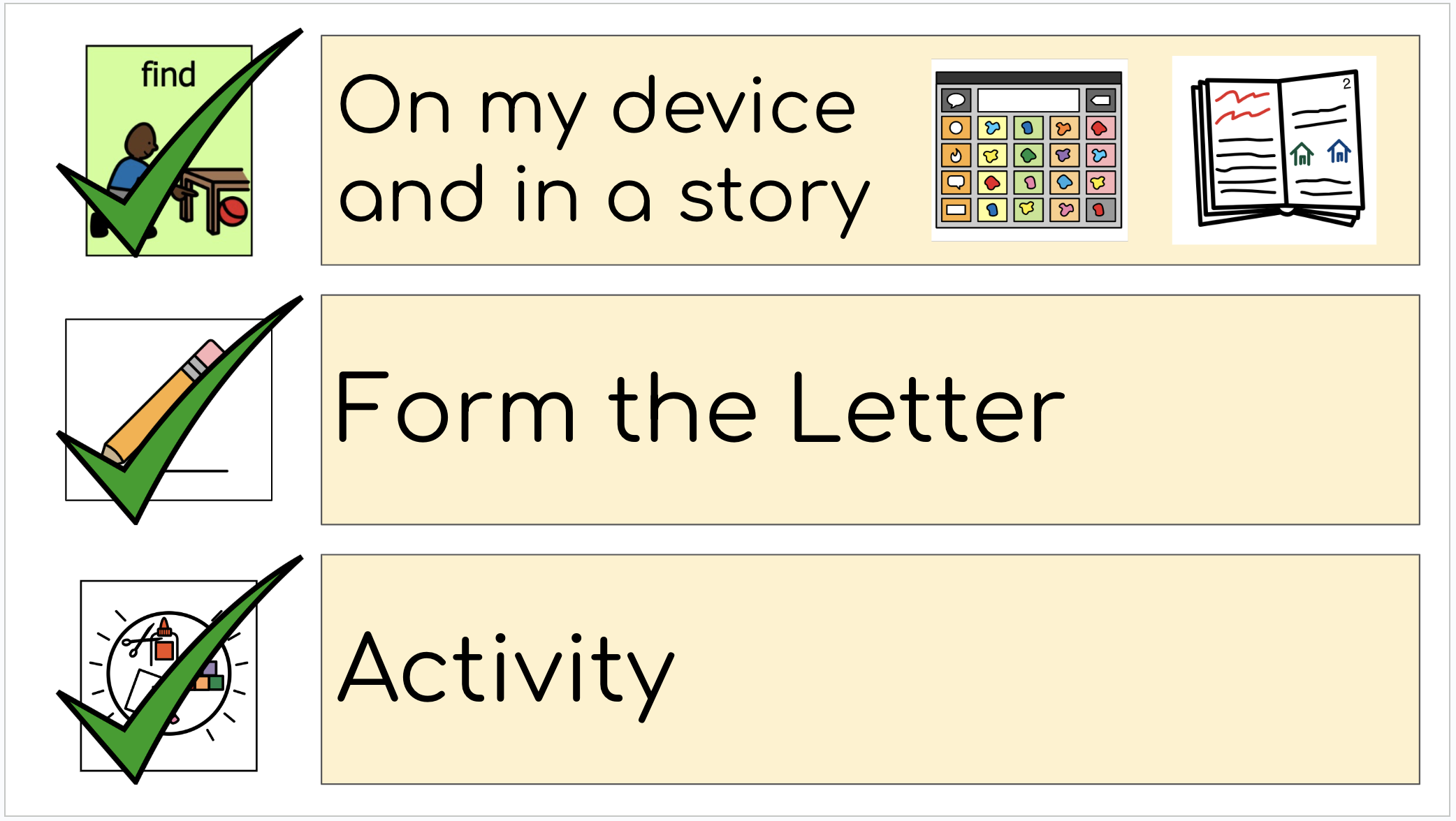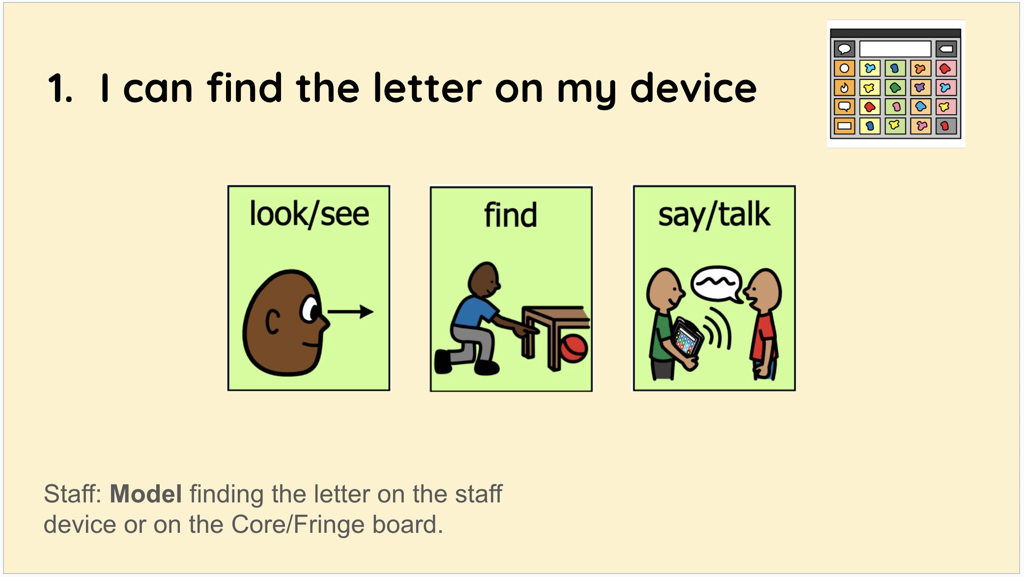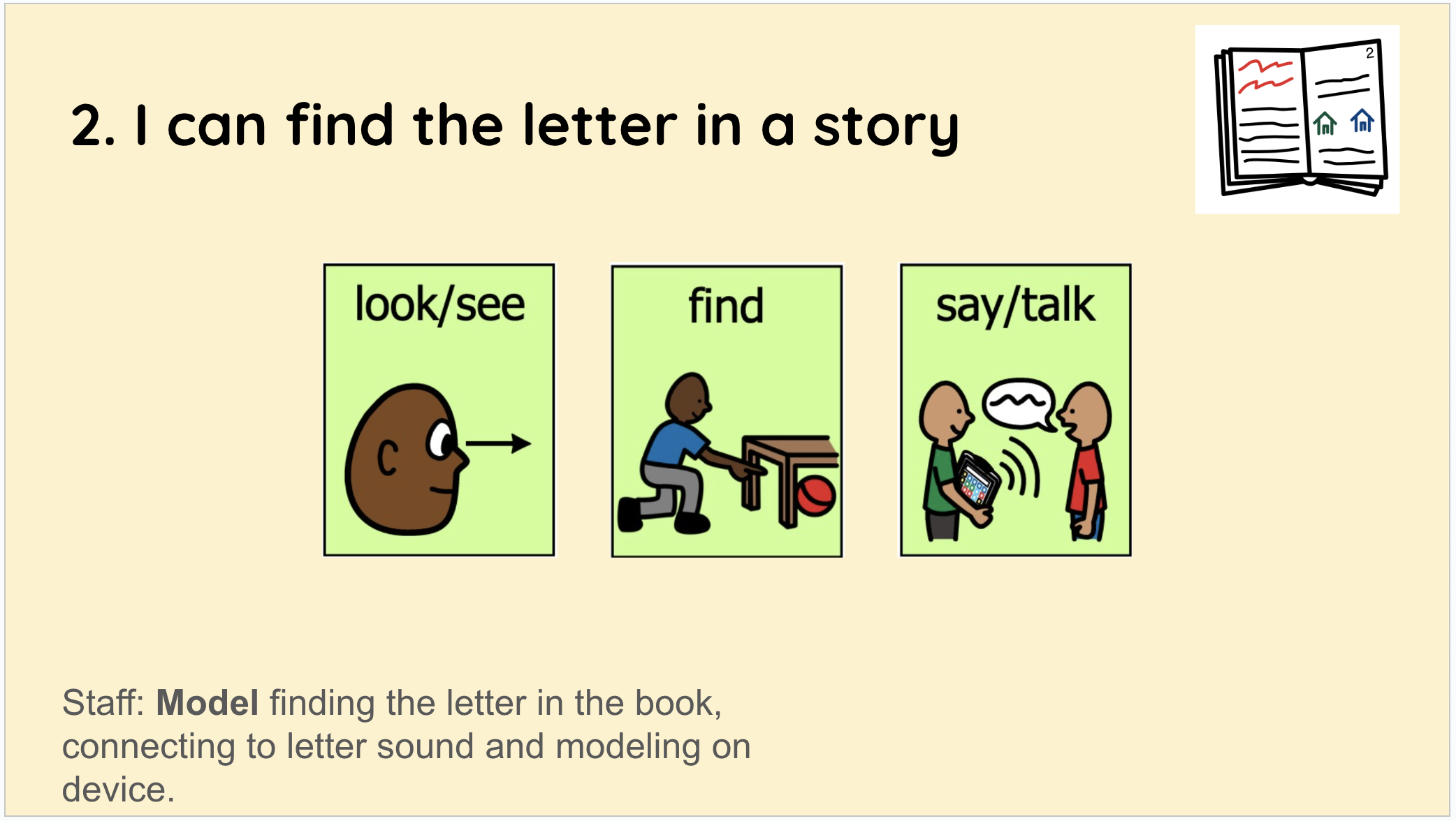 - We complete two activities during Letter of the Day block to locate the letter in print. The first activity is to find the letter on our AAC system. Staff model thinking aloud, navigating to the letter on a modeling device, and saying the letter.