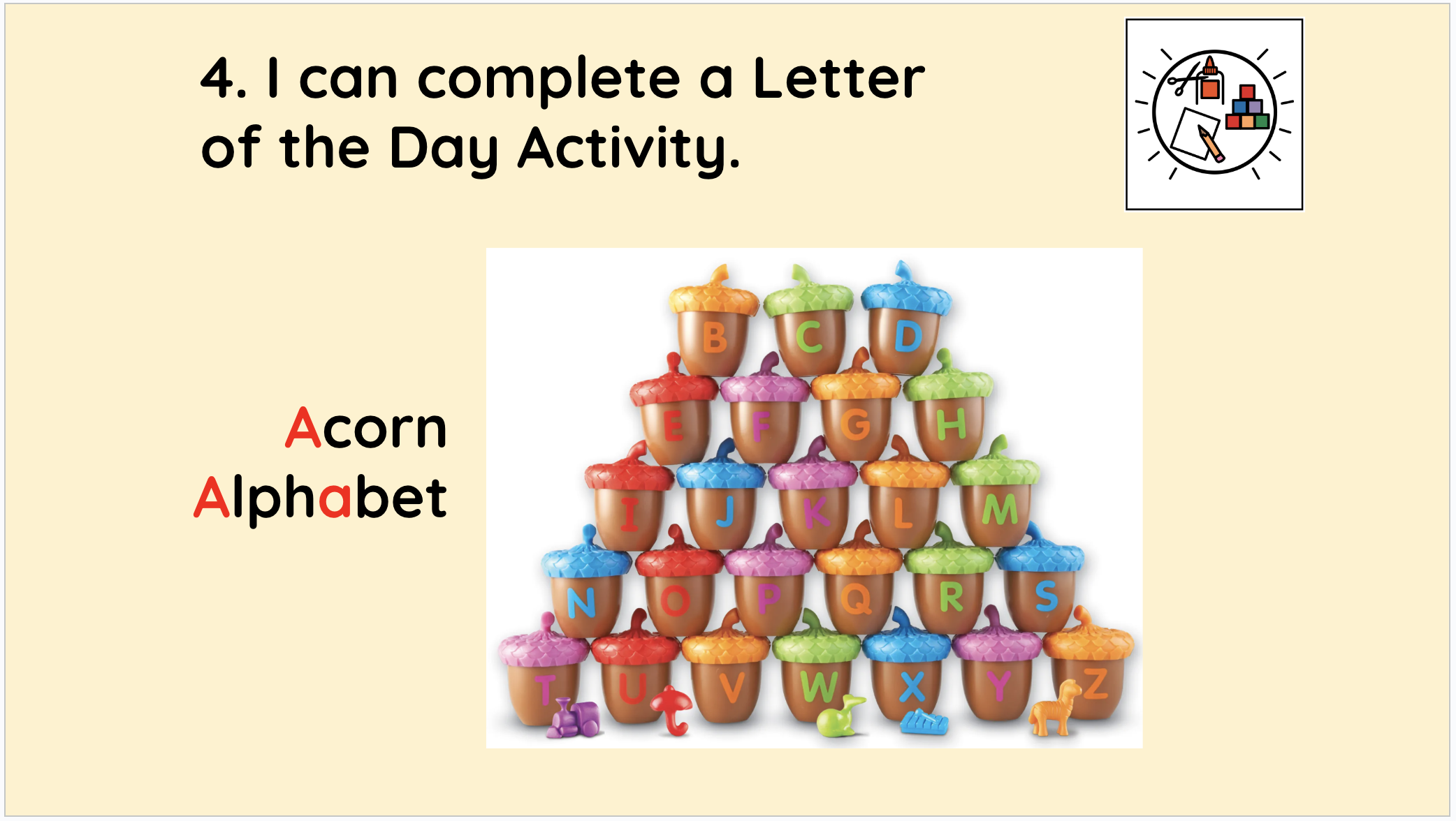 - Students complete a daily hands-on activity for additional practice with the letter or for supplemental phonics learning. Sometimes the activity is a letter craft (like an Octopus made out of an “O”), an iPad learning application, or another hands-on activity. For our A day, students worked with our Acorn Alphabet Activity from Lakeshore. I love these little acorns because they allow for multiple levels of practice – matching upper and lower case letters, full alphabet letter-sound correspondence, or focused letter exploration.